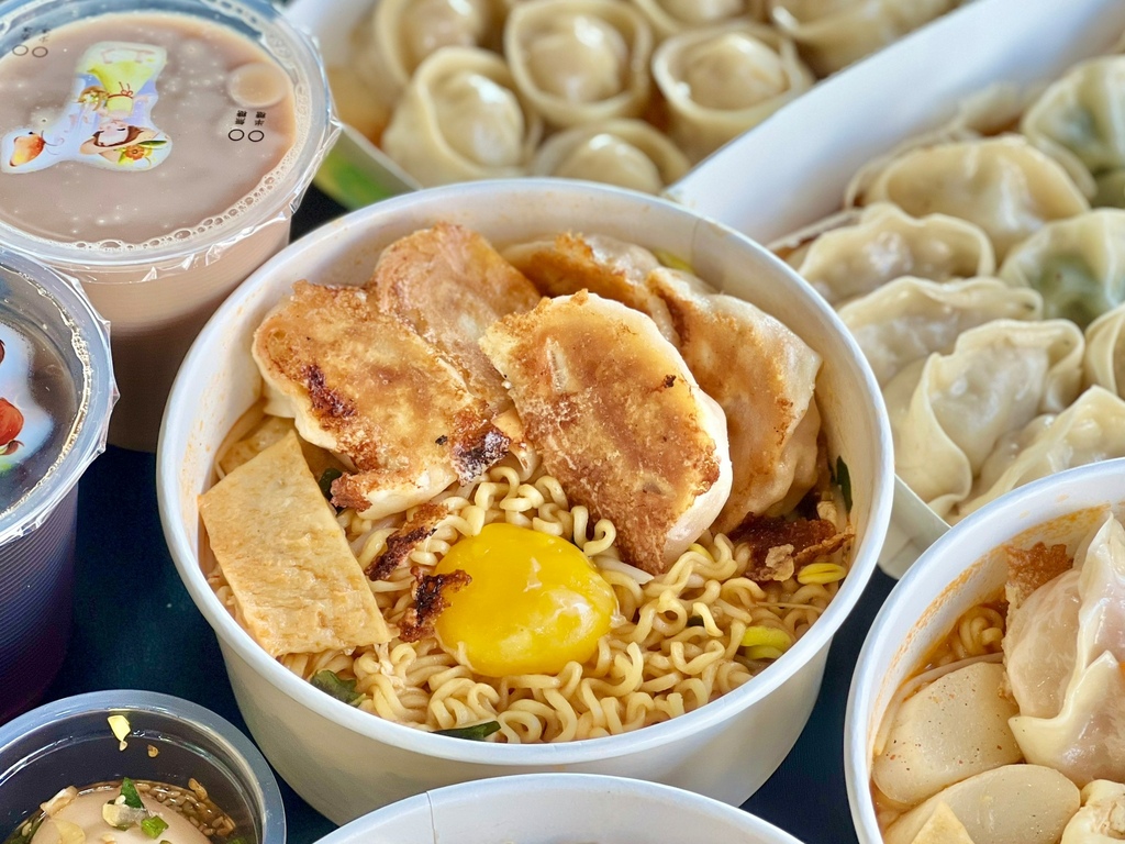 照片是為了小美阿姨要拍照才把泡菜煎餃放在辛拉麵上面(正常餐點是分開)